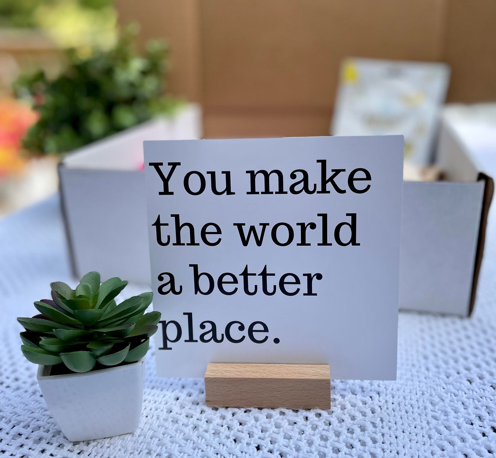 -"You Make the World a Better Place" print on cardstock placed in a wooden block