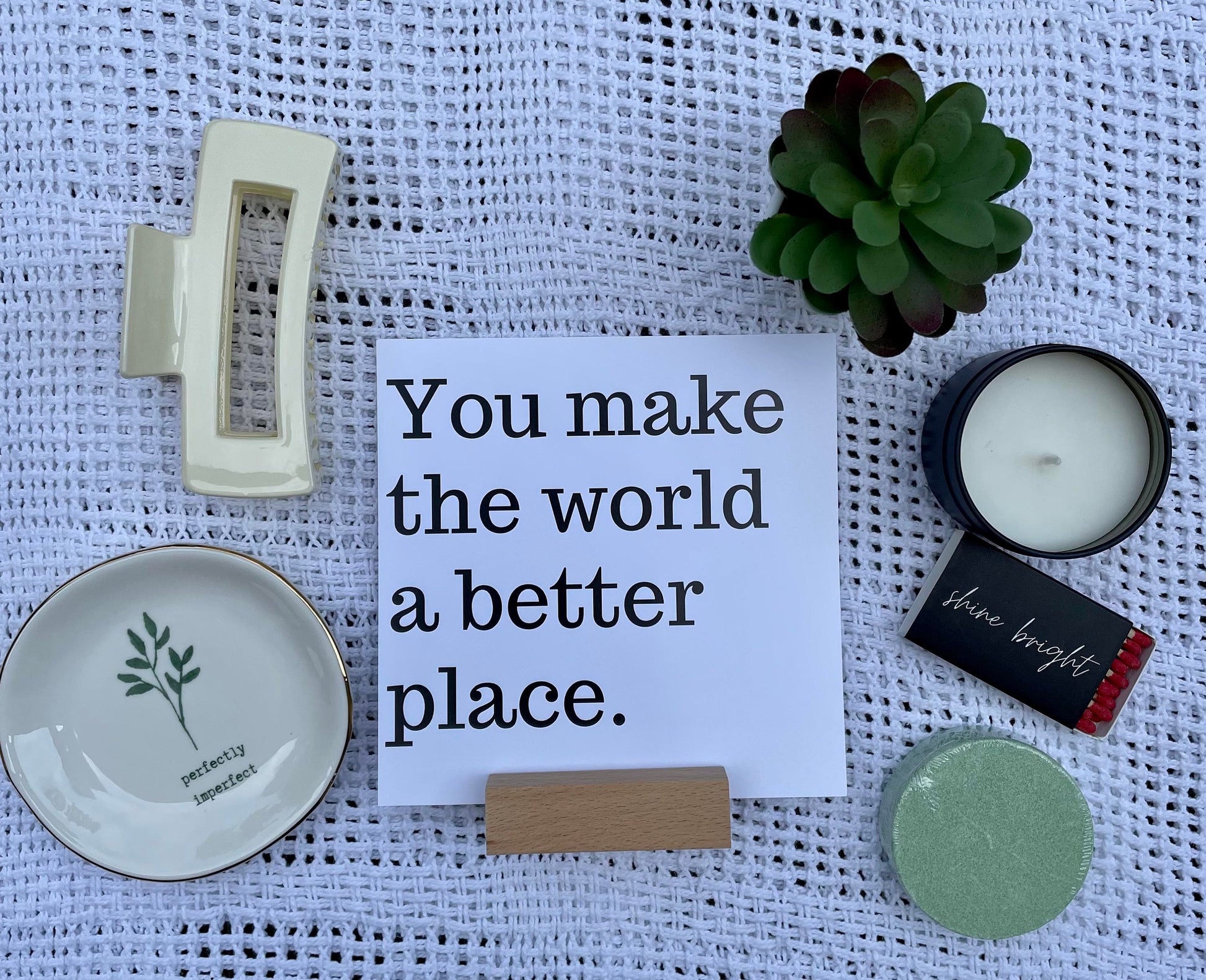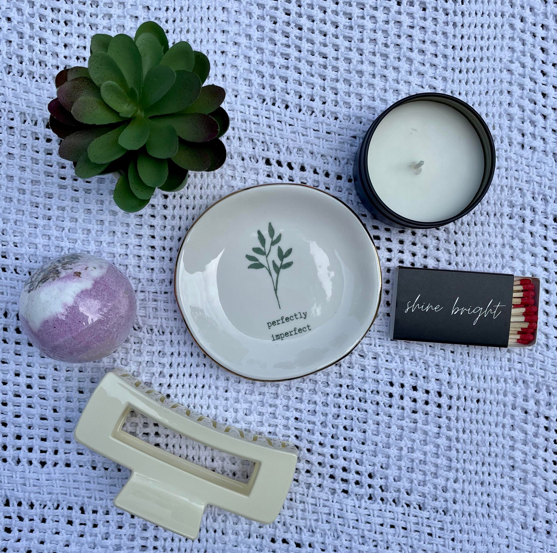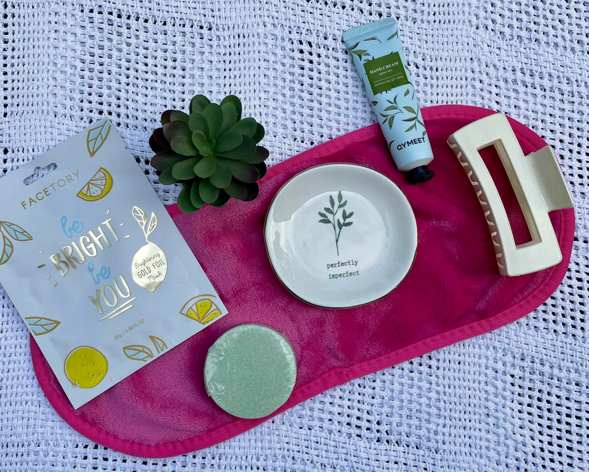 Materials: trinket tray,soy candle,spa head band,hair clip,shower steamer,faux succulent,facial mask,makeup eraser,perfectly imperfect,friend gift,best friend sign,personalized,gift