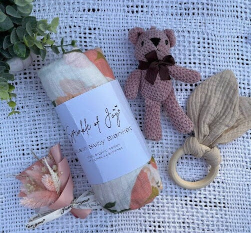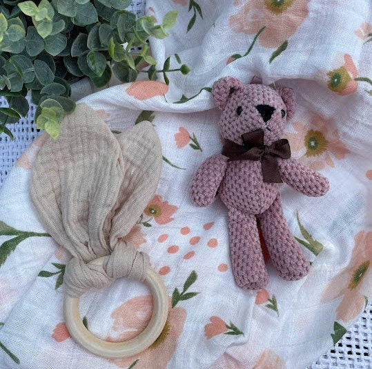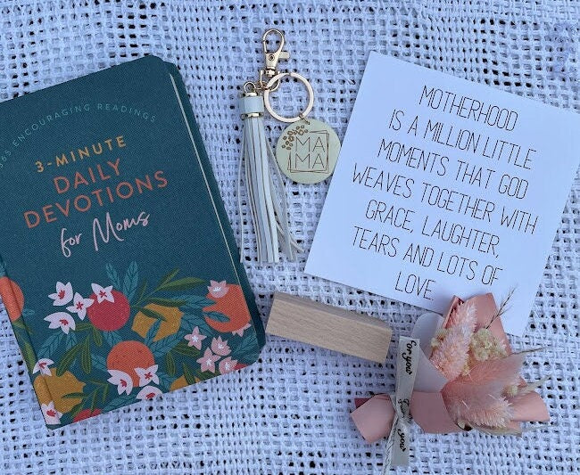 Materials: Mother Devotional,Motherhood Gift,Mama Gold Keychain,Baby Bear,Baby Teddy Bear,Baby Wooden Teether,Muslin Baby Girl Blanket,Muslin Baby Blanket,Muslin Floral Blanket,Motherhood Sign,Mother Sign,Faux Flower Bouquet,Baby Girl Blanket