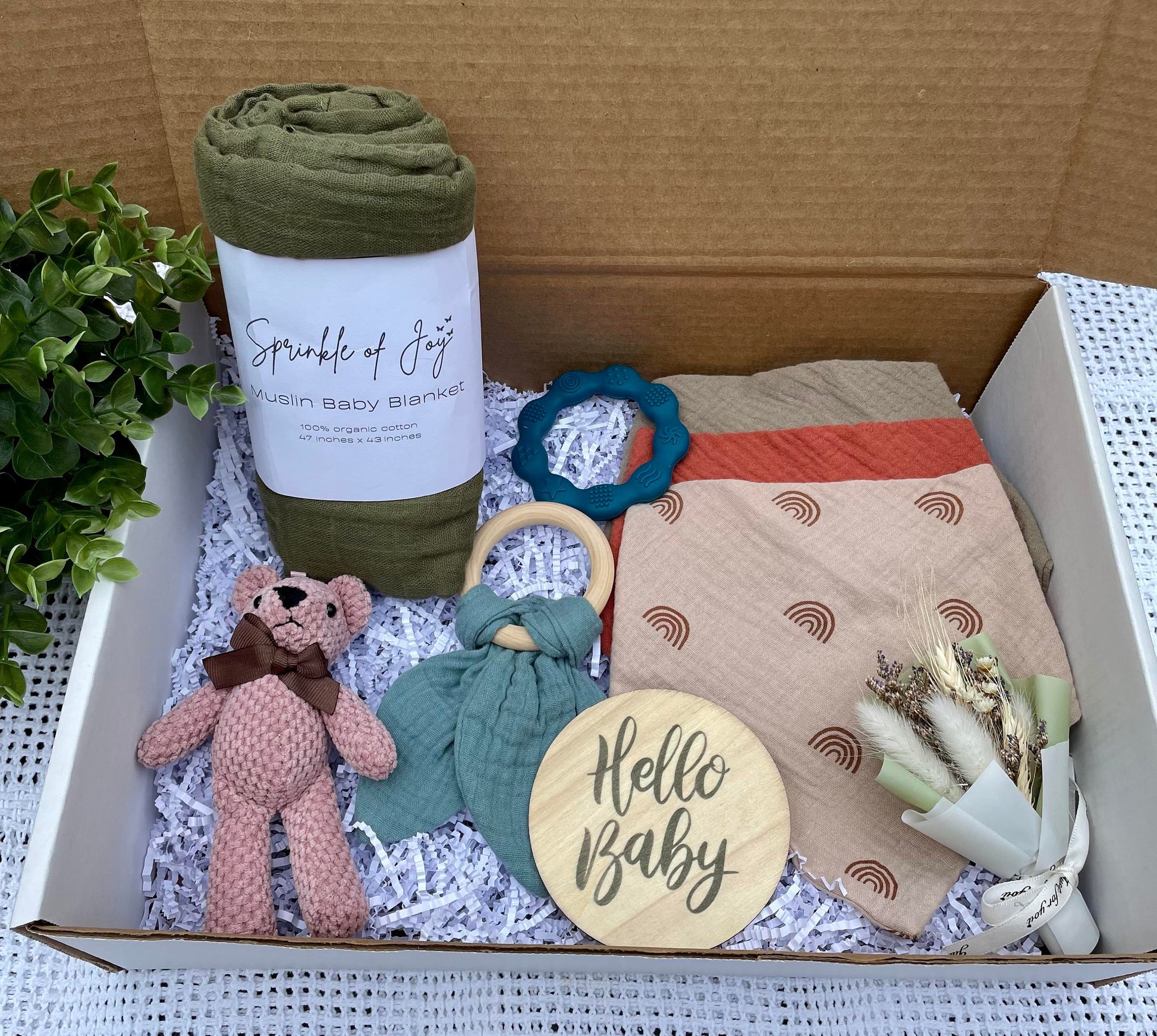Materials: baby toy,baby gift,mini teddy bear,faux flower bouquet,dried flower bouquet,baby girl blanket,baby girl bib,muslin bib,teething ring,wooden teether,baby headband,muslin blanket for boy,gender neutral baby blanket