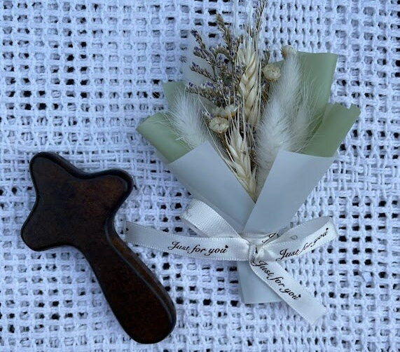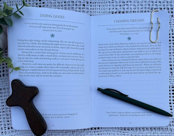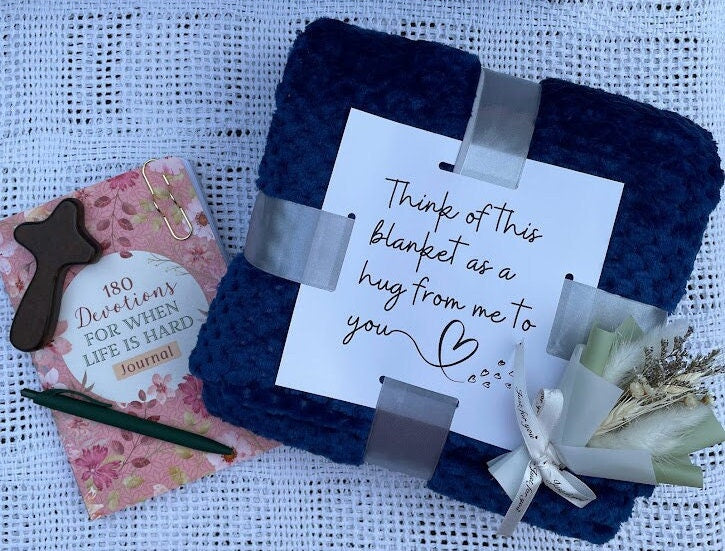 Materials: Cozy Blanket,Navy Blanket,Faux Flower Bouquet,Faith Devotional,Pen,Devotional,Devotional Book,Wooden Cross,Cross,Gold Pen Clip
