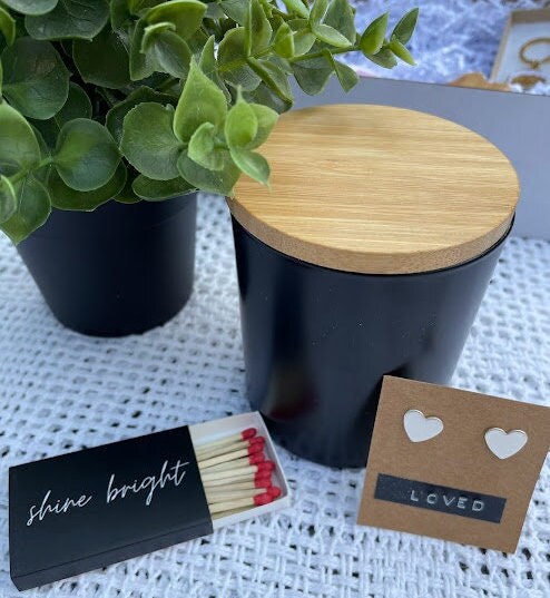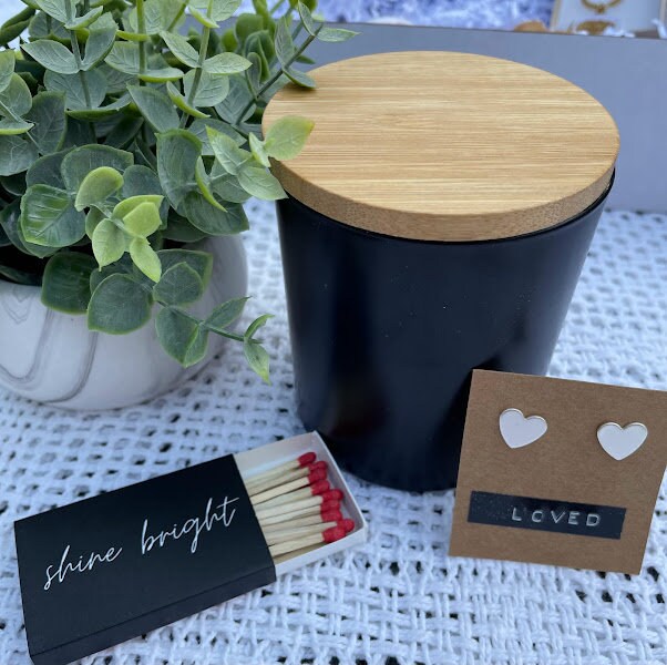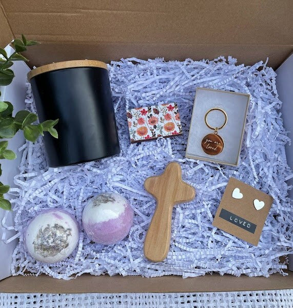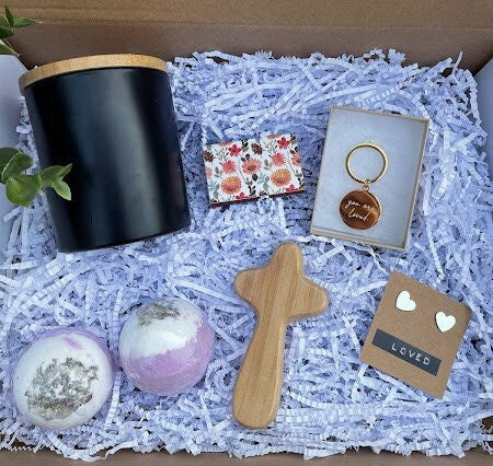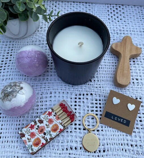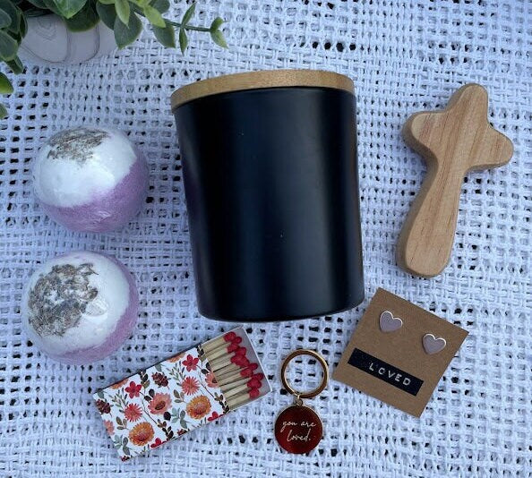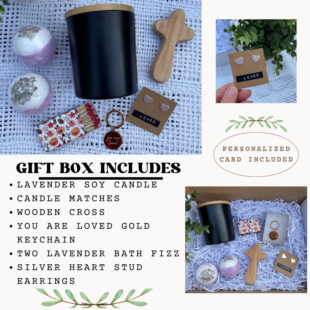 Materials: Silver Earrings,Gold Keychain,Engraved Keychain,Wooden Cross,Lavender Soy,Lavender Soy Candle,Lavender Bath,Spa Bath,Lavender,Soy Candle,Stud Silver Earrings
