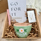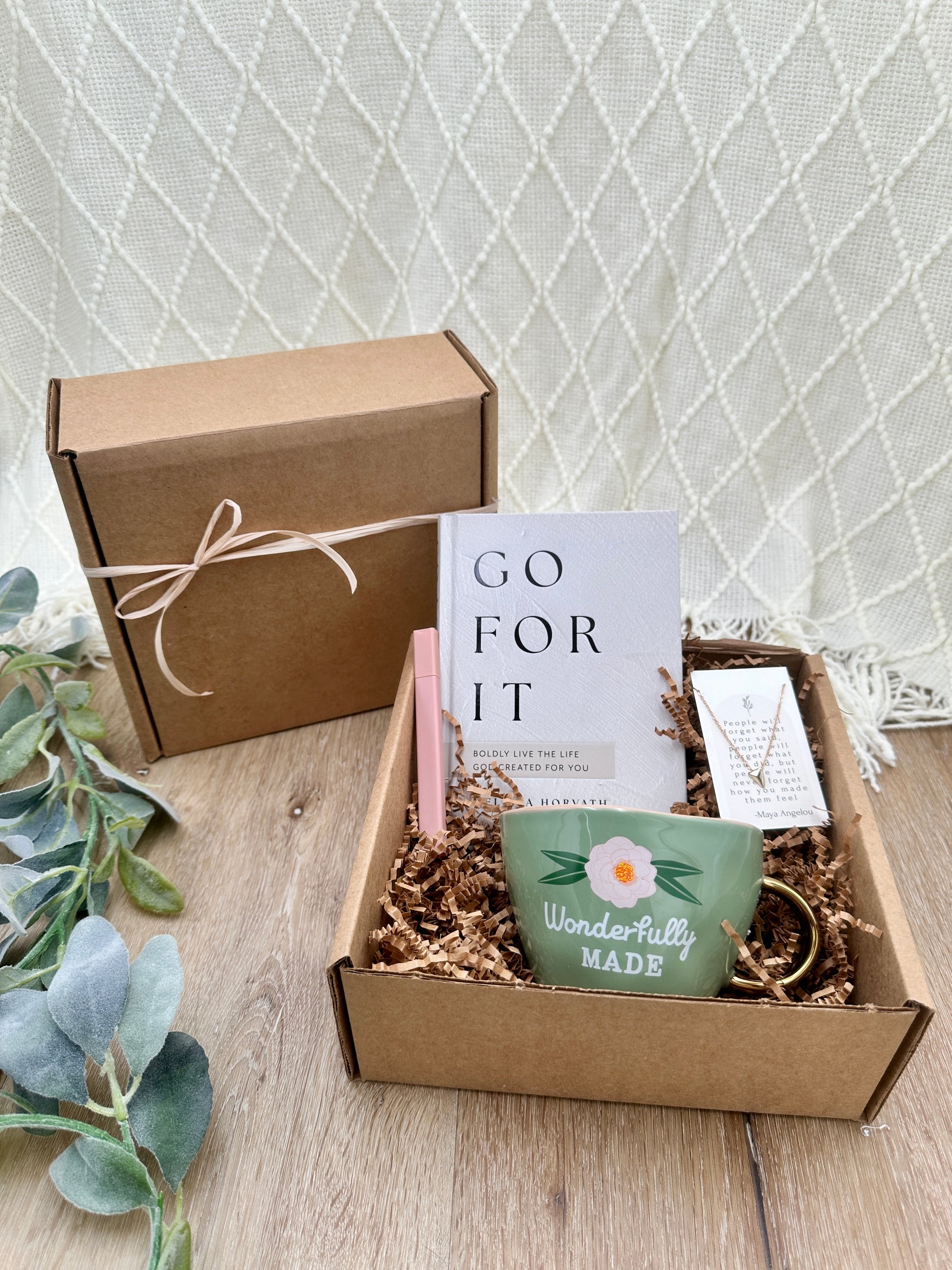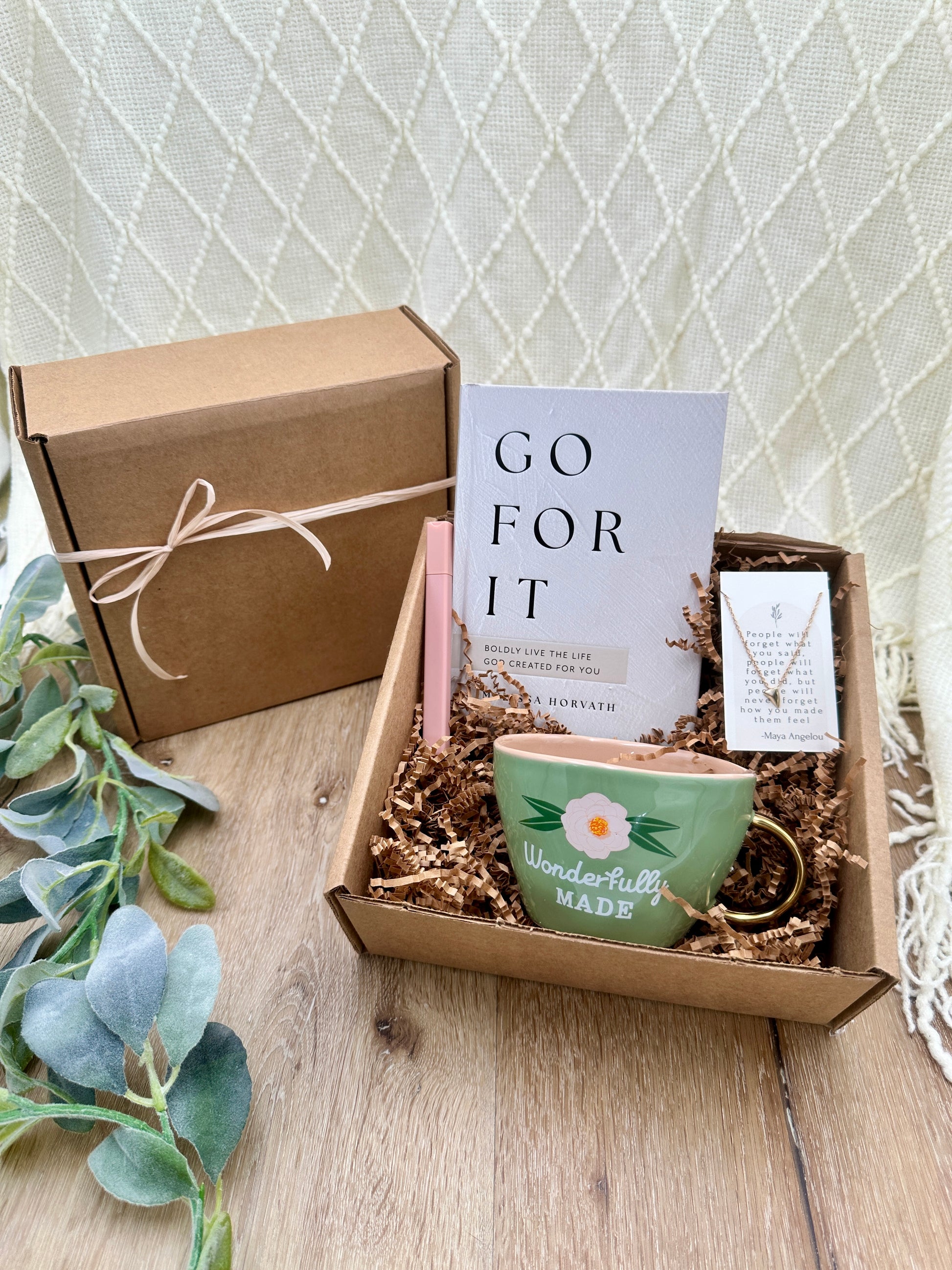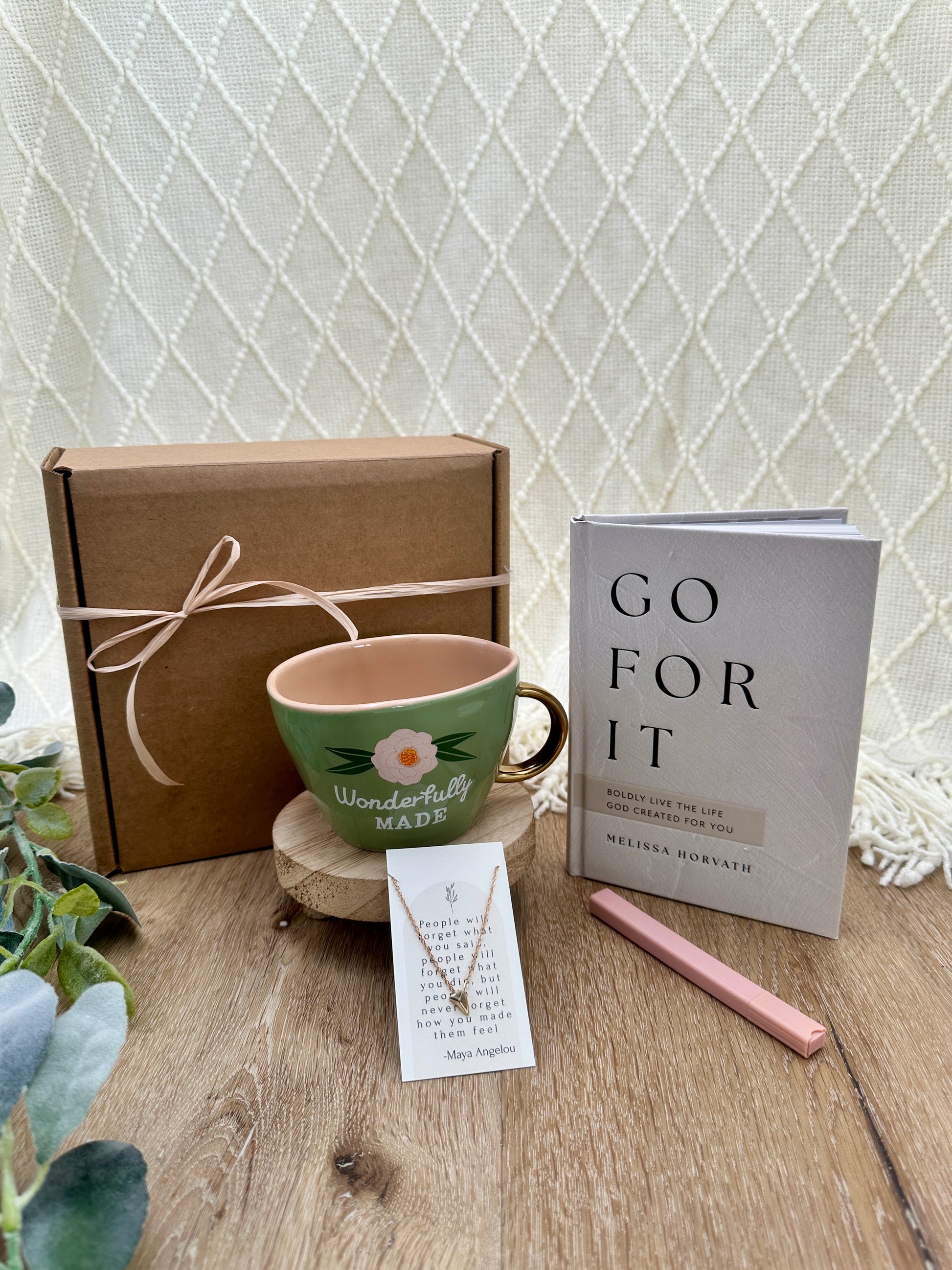 Get ready to start your day on the right foot with our Go For It Devotional Gift Box. This charming set includes a hand crafted ceramic mug with a delicate floral design and the powerful message "wonderfully made" with a fun gold handle. Along with a devotional and a necklace featuring a quote by Maya Angelou on the packaging, this gift set is sure to bring inspiration and positivity to your daily routine.