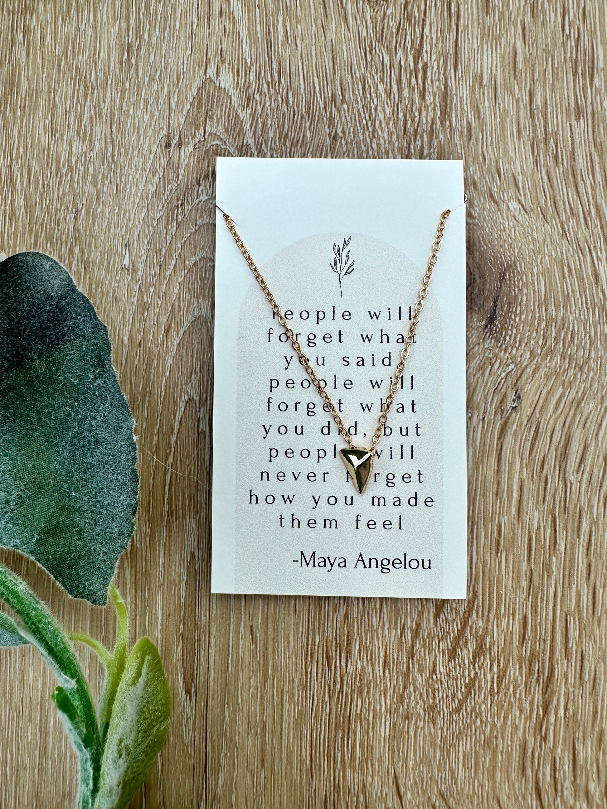 -Necklace with packaging that reads "People will forget what you said, people will forget -what you did, but people will never forget how you made them feel" by Maya Angelou