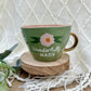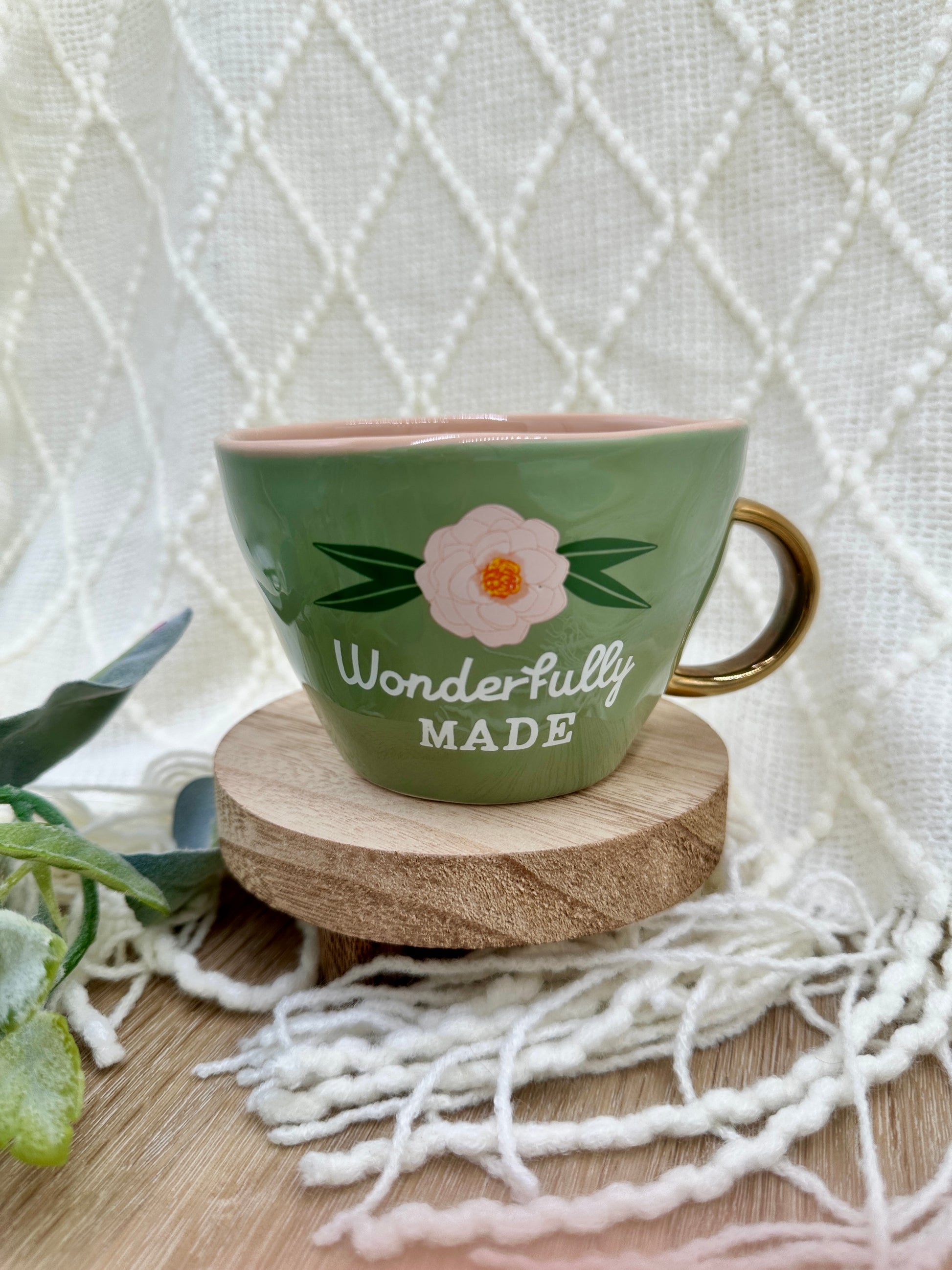 -Handcrafted "Wonderfully Made" mug with dainty floral and gold handle
