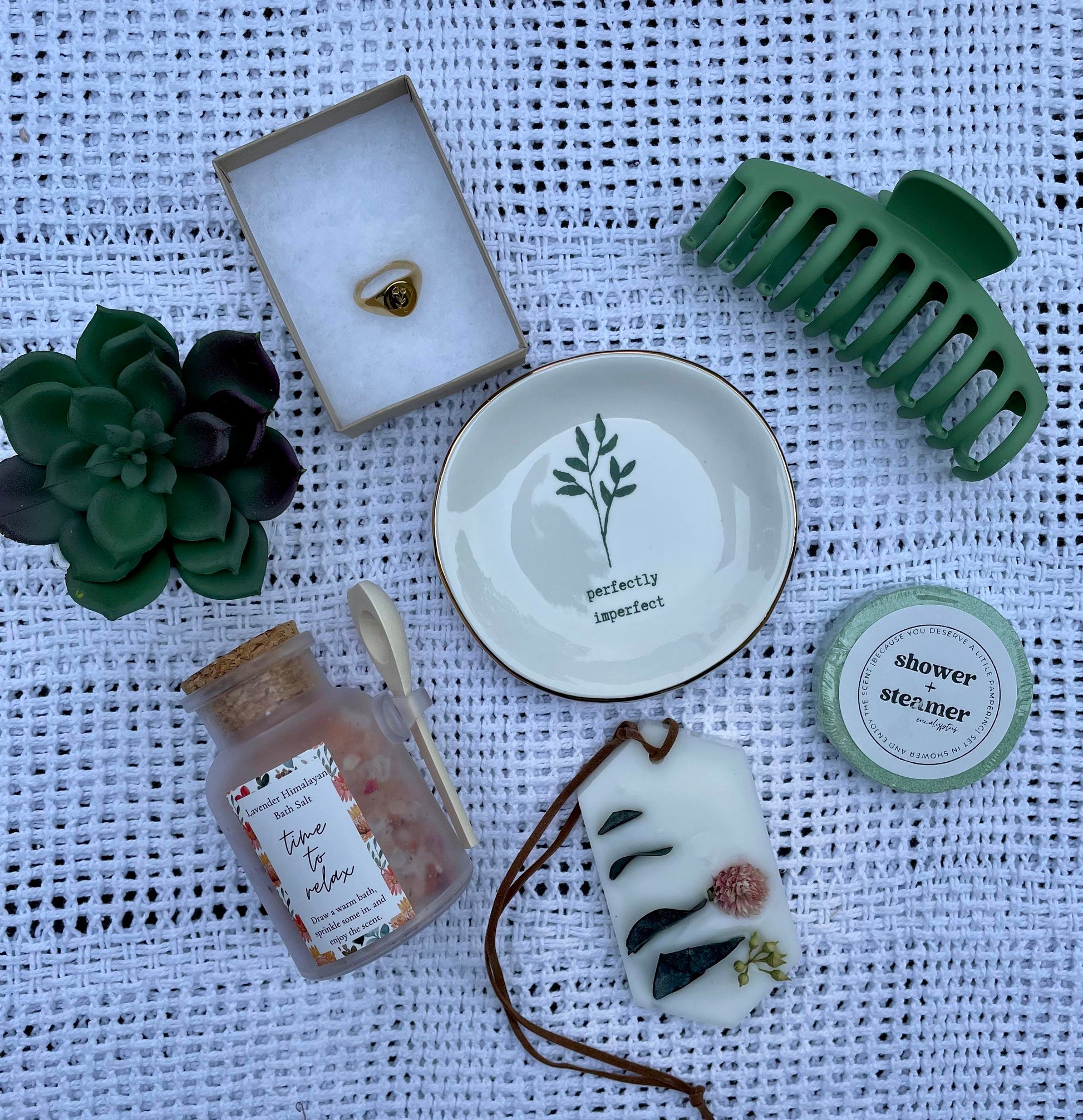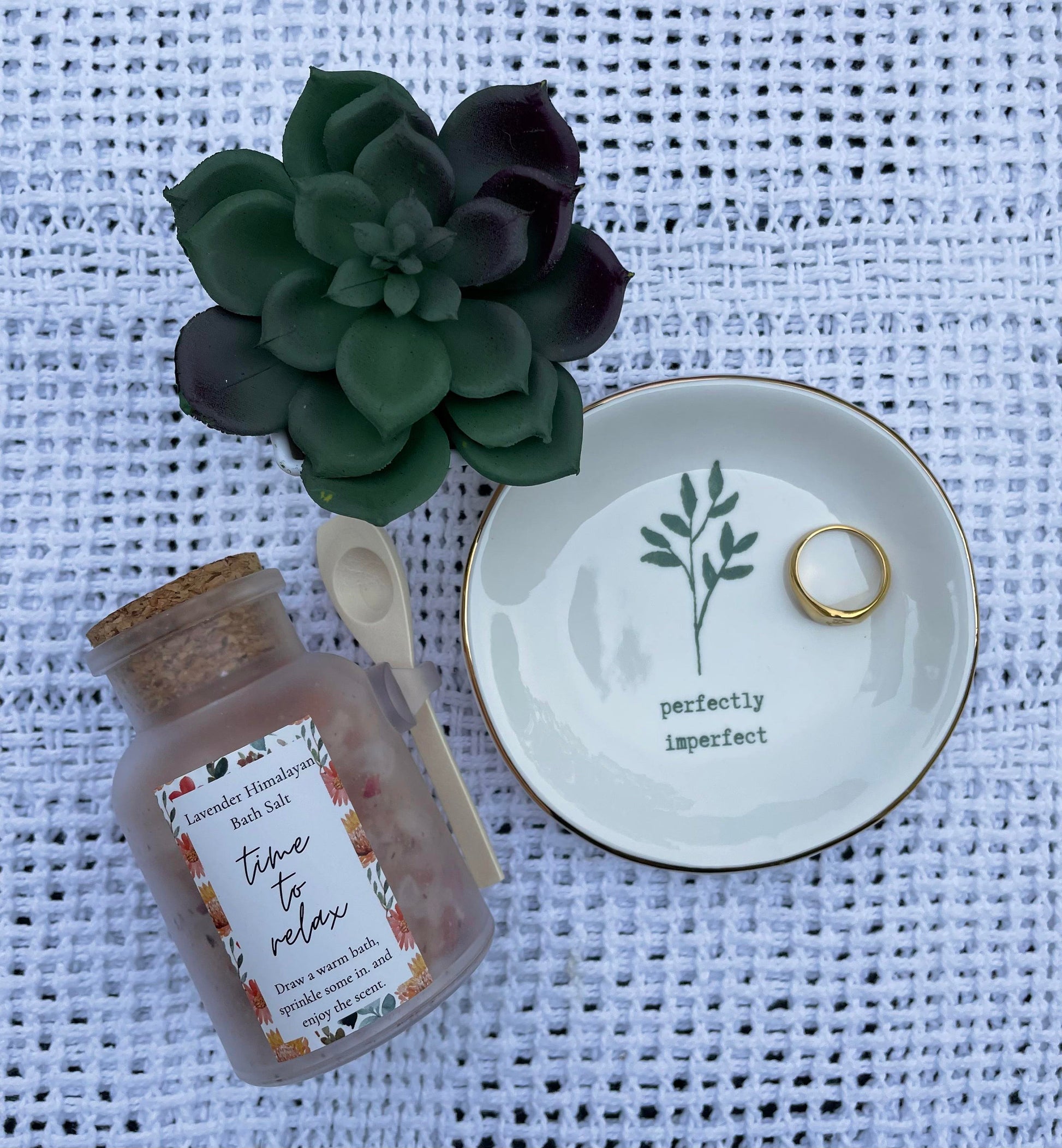 Materials: ceramic trinket tray,engraved ring,bath salts,soy wax,faux succulent