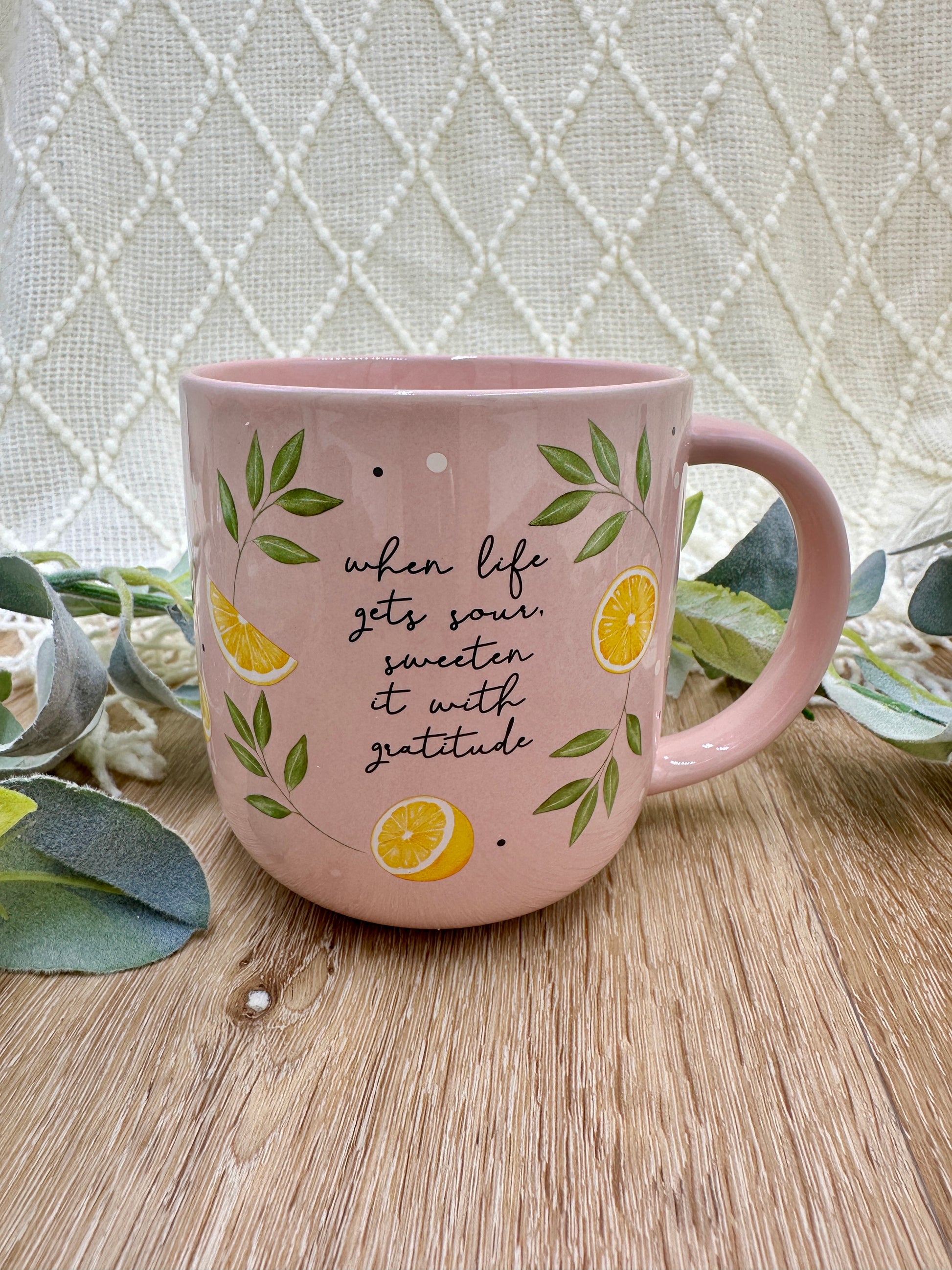 - 18 oz Aesthetic pink mug with lemons and Quote "When life gets sour, sweeten it with gratitude"
