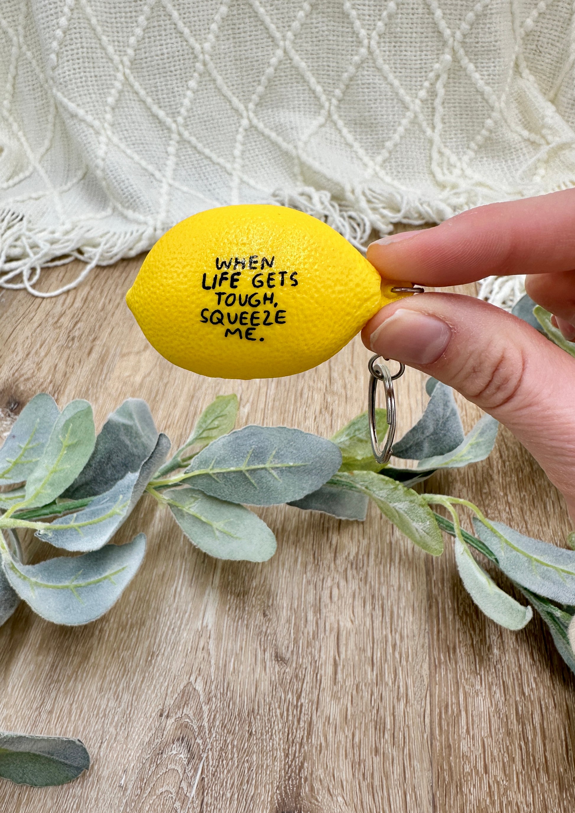 - "When Life Gets Hard Squeeze Me" Lemon shaped stress ball keychain