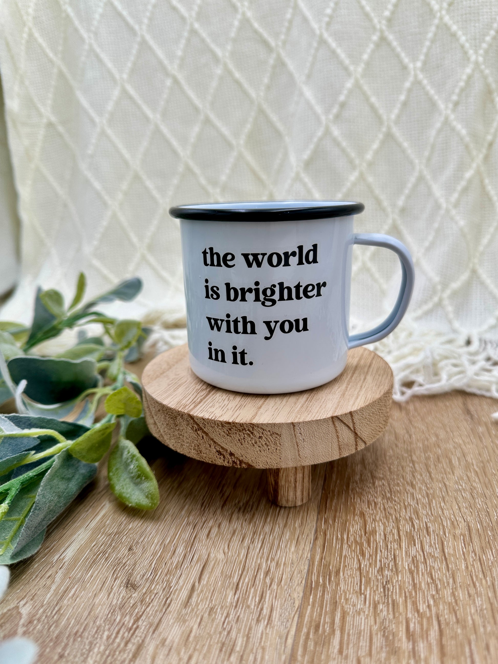 Enamel Coffee mug that says "the world is brighter with you in it"